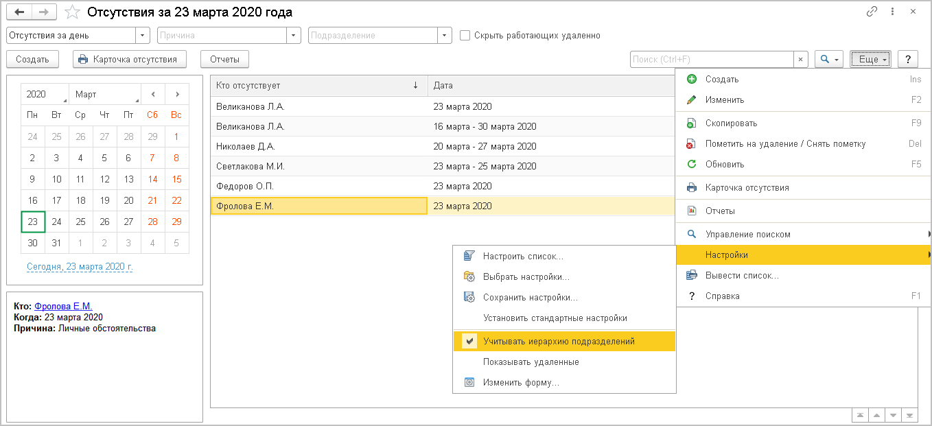 Для удобной работы в отделах и группах по команде Еще – Настройки теперь доступна команда Учитывать иерархию подразделений.