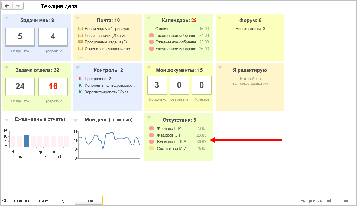 На рабочем столе Текущие дела появился виджет Отсутствия.