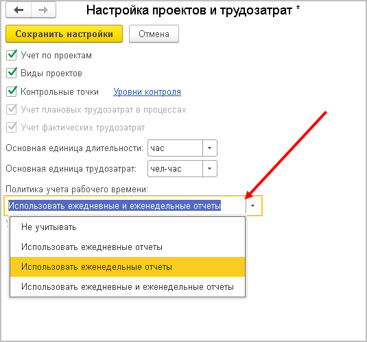 Как включить: для использования еженедельных отчетов нужно изменить политику учета рабочего времени: