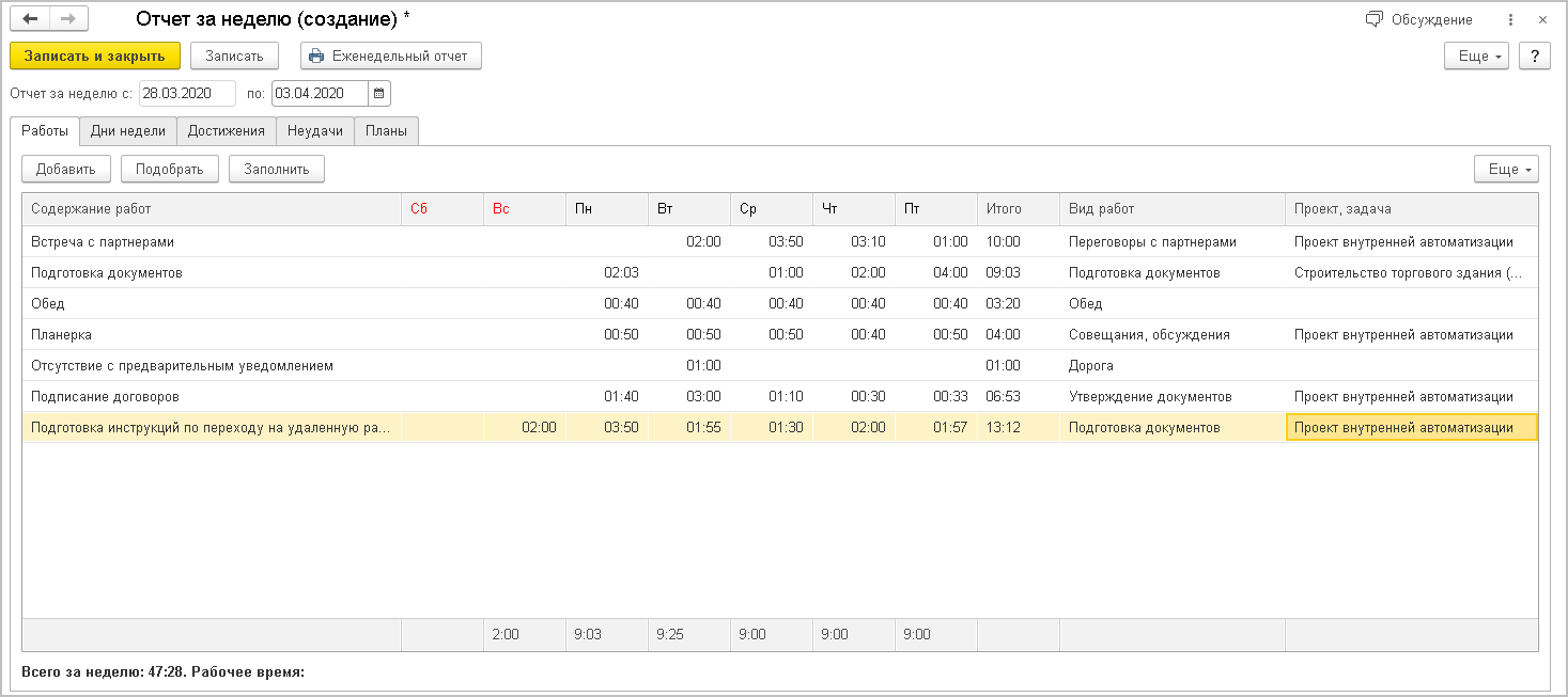 На закладке Дни недели нужно вручную отметить, какие из дней в течение недели являлись больничными, отсутствием, отпуском. Далее заполнить достижения, неудачи, планы.