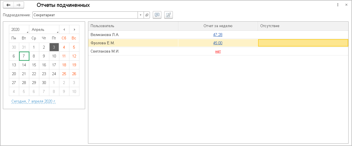 Теперь в списке Отчеты подчиненных выводятся не просто заполненные отчеты, а сотрудники подразделения с пометкой о наличии отчета или его отсутствии.