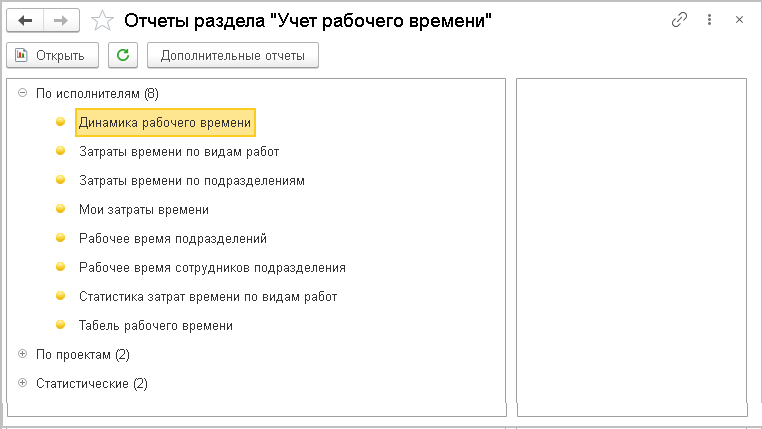 Для анализа более крупных периодов, а также для анализа по крупным отделам и по предприятию в целом в разделе Учет времени – Отчеты появились три новых варианта отчета.