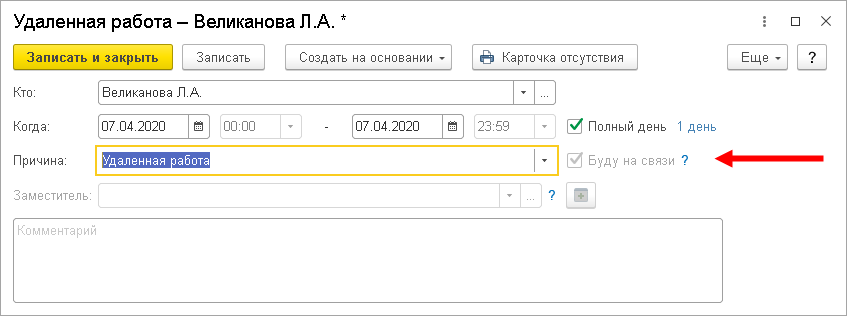 Если вы выбрали причину отсутствия Удаленная работа, то флаг Буду на связи устанавливается автоматически без возможности его снять, также недоступно поле Заместитель. Ведь если вы работаете удаленно, вы должны быть на связи любым из оговоренных на вашем предприятии способов. Если вы недоступны, необходимо выбрать другую причину отсутствия.