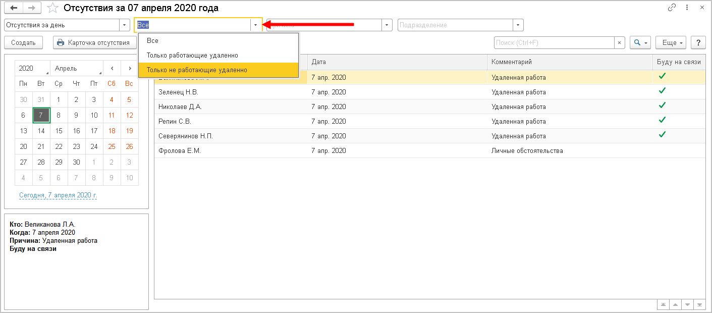 В общем писке отсутствующих вместо флага Скрыть работающих удаленно появился отбор Все / Только работающие удаленно / Только не работающие удаленно.