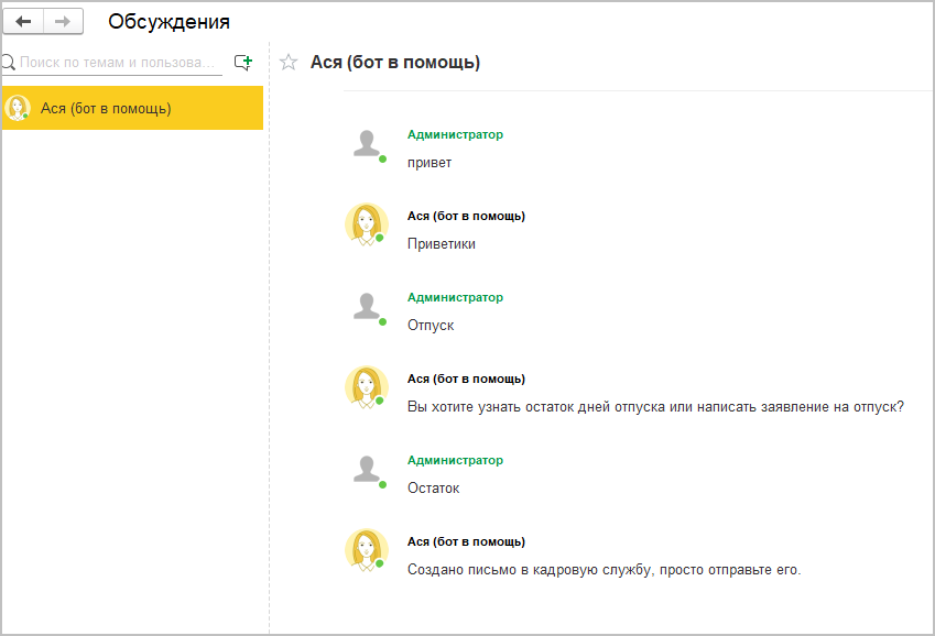 Мы создали специального пользователя Ася (бот в помощь). Если вы хотите поменять имя или фотографию – сделайте это в карточке этого пользователя. Затем выберите его в настройках и придумайте приветственное сообщение.