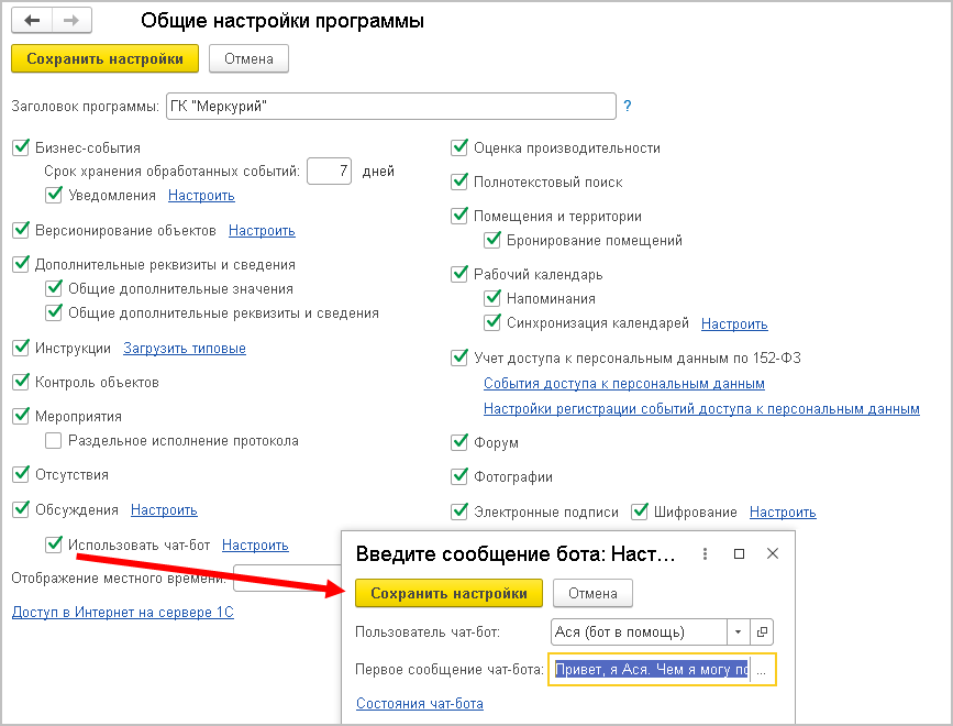 Чат-бота включает администратор Настройки программы – Общие – Использовать чат-бот – Настройки. Настройки отображаются только если в программе включены Обсуждения.