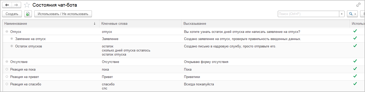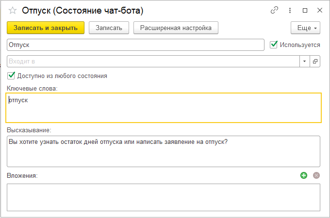 Если вы хотите, чтобы чат-бот выполнил какое-то действие, например, создал письмо или отсутствие, открыл какой-то список с отборами, нажмите кнопку Расширенные настройки. Для настройки действия уже потребуются навыки программирования на языке 1С. В качестве примера можно использовать скрипты из демобазы.