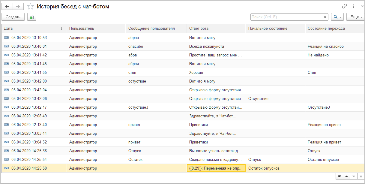 В списке видно, что спрашивал пользователь и что отвечал ему чат-бот. Эта информация позволит улучшить наполнение ключевых слов для состояний и понять потребности пользователей для новых настроек состояний.