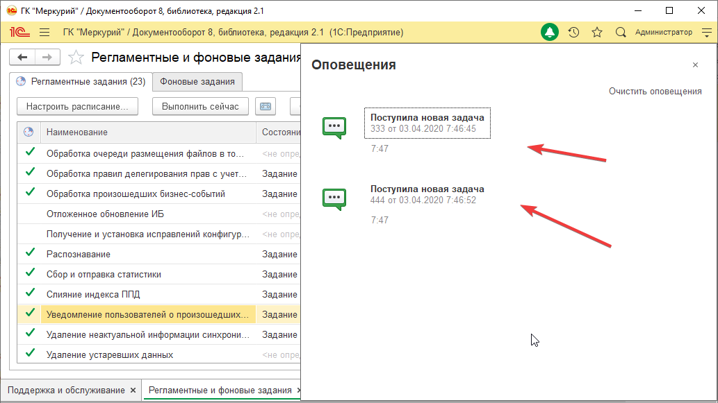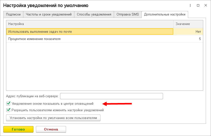 После обновления получение уведомлений в центре оповещений включится автоматически. Чтобы отключить это поведение, в настройках уведомлений достаточно снять флаг Уведомления окном показывать в центре оповещений.