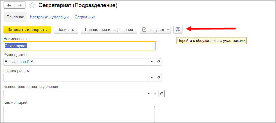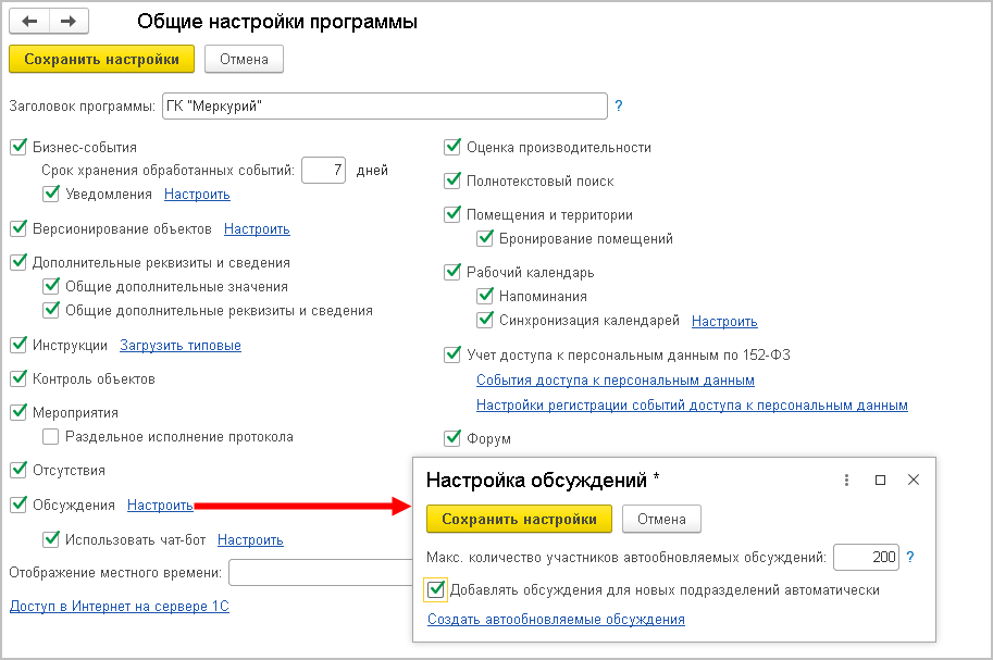 Если флаг Добавить обсуждения для новых подразделений автоматически установлен, то при добавлении новых подразделений автоматически появится и чат для его участников.