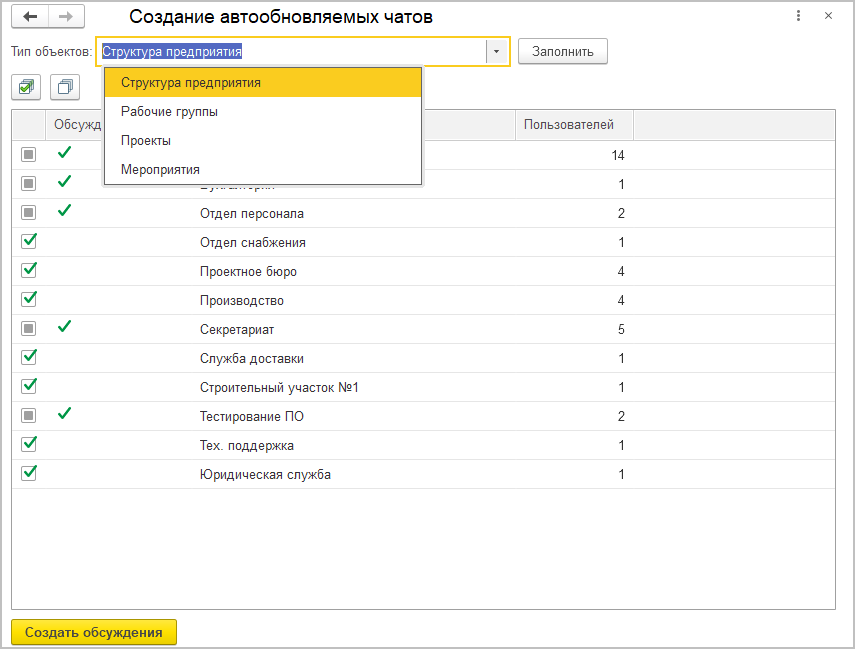 В этот чат автоматически попадут все сотрудники выбранного подразделения, участники мероприятия, проекта или рабочей группы.
