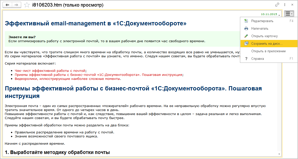 Работа со ссылками поддерживается и в редакторе html-, и txt-файлов. Если вы вставляете ссылку на данные в 1С:ДО, то ее представление меняется на наименование этих данных. Если ссылка на справочник Файлы, то по ней откроется сам файл, а не его карточка.