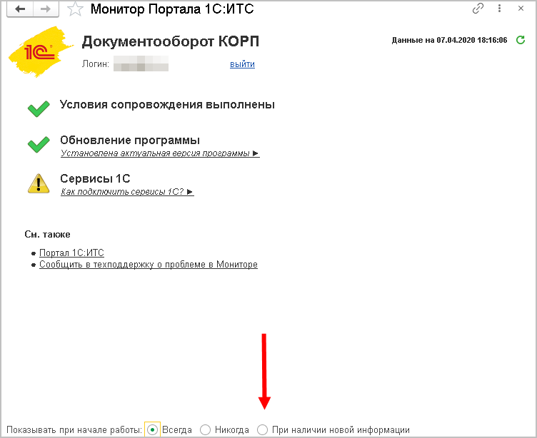 По умолчанию Монитор Портала 1С:ИТС с информацией об обновлении. Показ каждый день можно отключить, выбрав вариант При наличии новой информации.