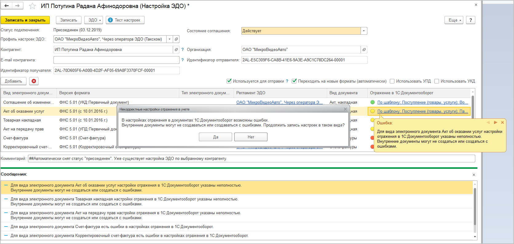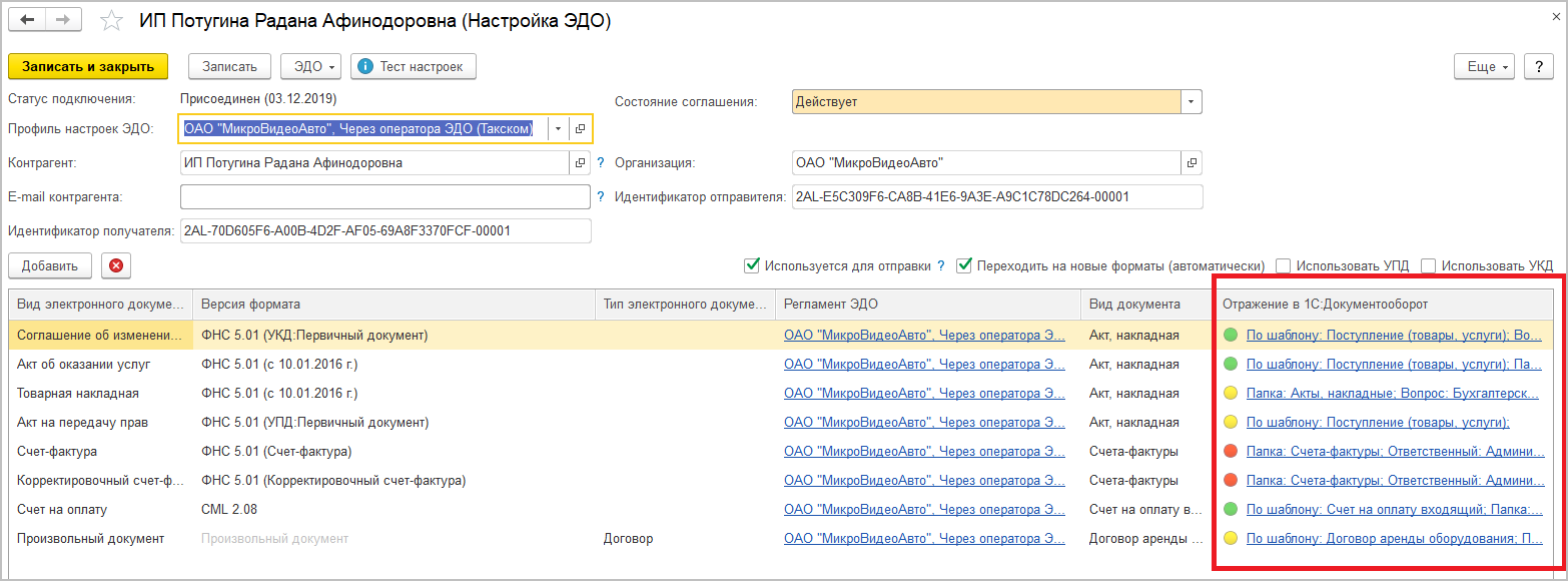 В карточке настроек обмена ЭДО с контрагентом настройки создания документов вынесены в отдельную колонку, в которой виден индикатор корректности этих настроек.