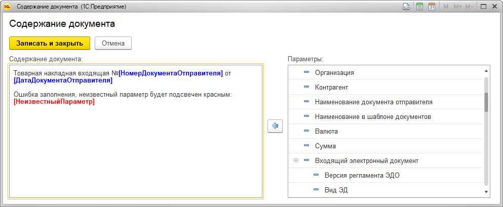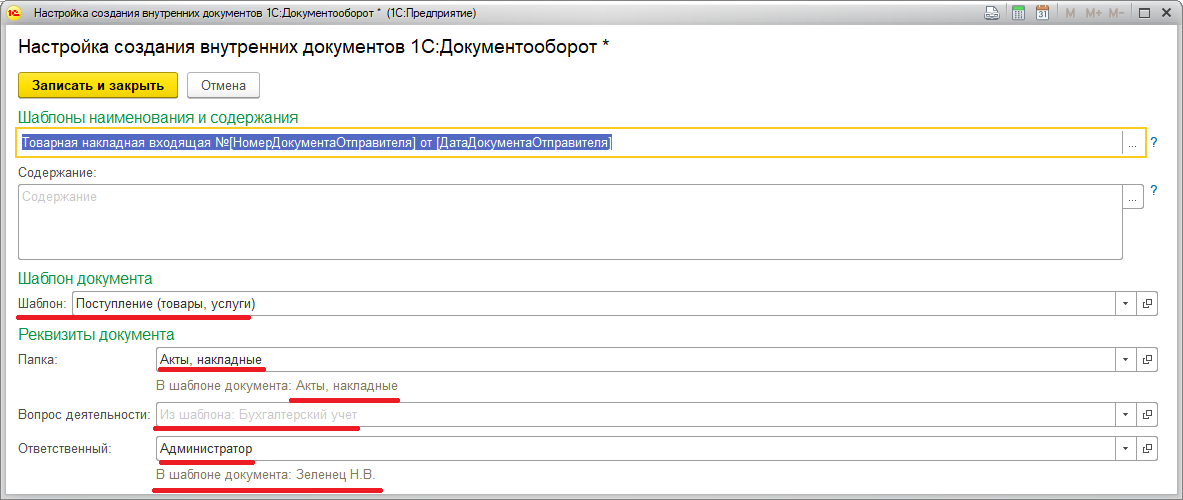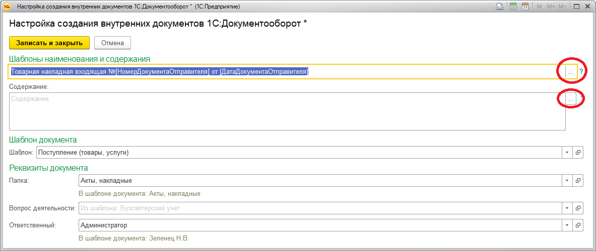 Появилась возможность настроить заполнение наименования и содержания входящих документов. Для этого нажмите на кнопку выбора в шаблонах наименования и заполнения.