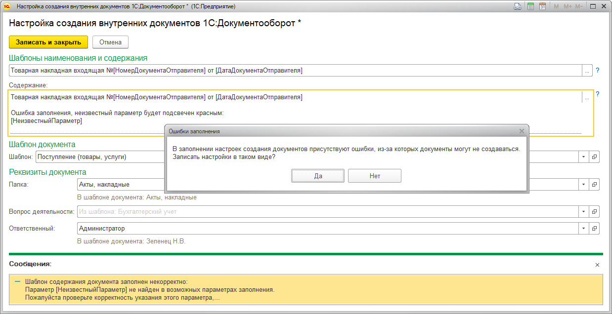 В случае ошибки в шаблоне или незаполненного наименования программа предупредит о том, что существуют проблемы и документы будут созданы с ошибками. При этом правило можно записать даже с ошибками, для возвращения к его редактированию позже.
