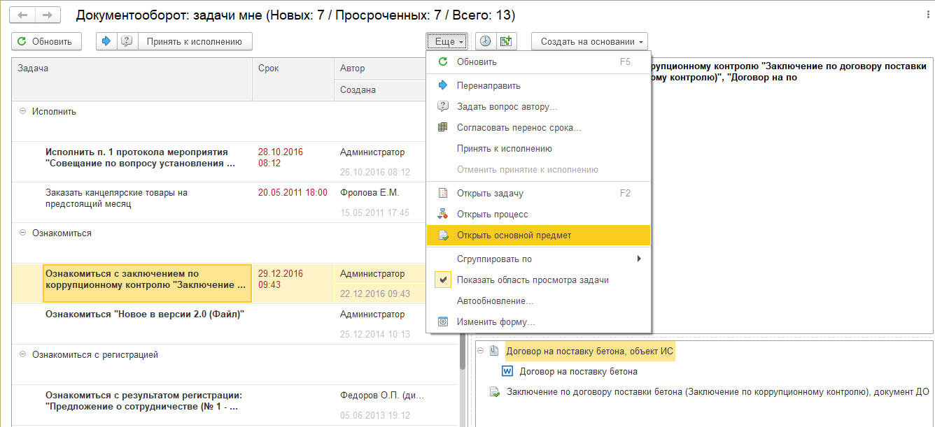 Теперь в списках Задачи мне и Задачи интегрированной с 1С:ДО системы стало проще понять, есть ли связанный с предметом объект ИС или нет. Соответствующая пометка отображается в заголовке предмета.