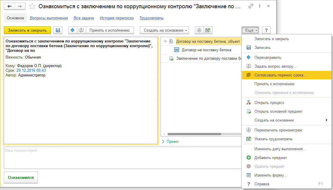 По команде откроется карточка запроса на переноса срока. Подробнее об этой возможности: здесь.