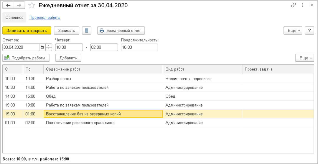 Появилась возможность вводить работы после полуночи в тот же день (23:00 – 01:00, 01:00 – 02:00), не выделяя их в отчет следующего дня.