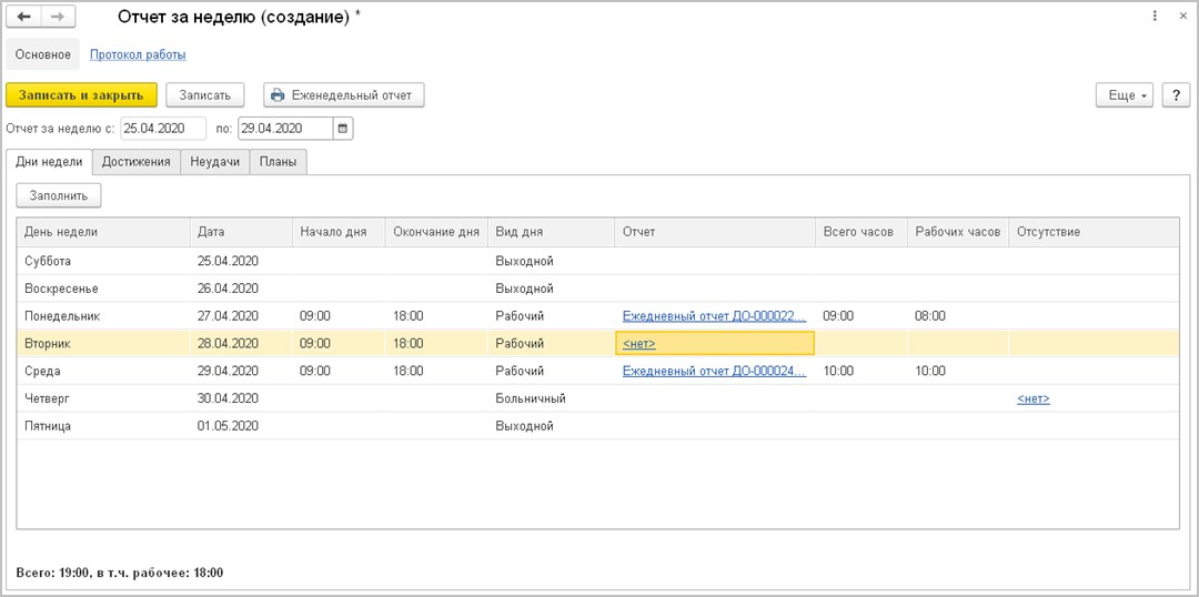 Например, забыв создать на неделе какой-то ежедневный отчет и обнаружив это при создании отчета за неделю, не придется идти в список отчетов, создавать отчет за день, потом перезаполнять еженедельный – можно просто перейти по ссылке и ввести недостающий отчет.