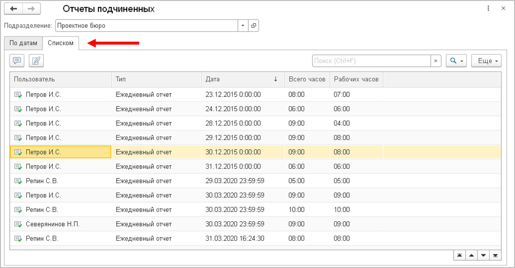 В списке Отчеты подчиненных теперь можно увидеть не только отчеты по дням, но и доступные руководителю отчеты списком с возможностью проверить, например, отчеты одного сотрудника за несколько дней.