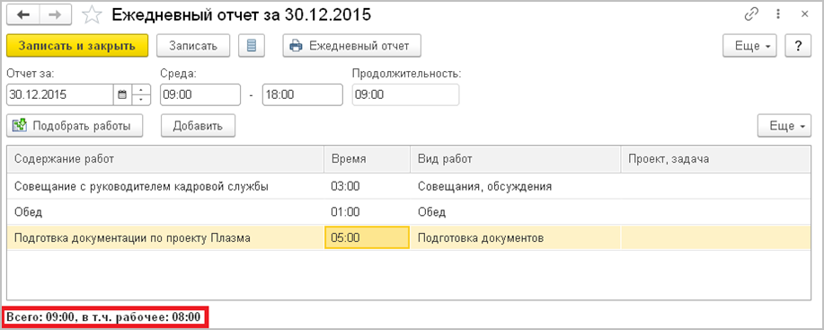 И при заполнении, и при просмотре отчетов, и в отчетах о трудозатратах теперь явно выводится как общее время, так и рабочее.