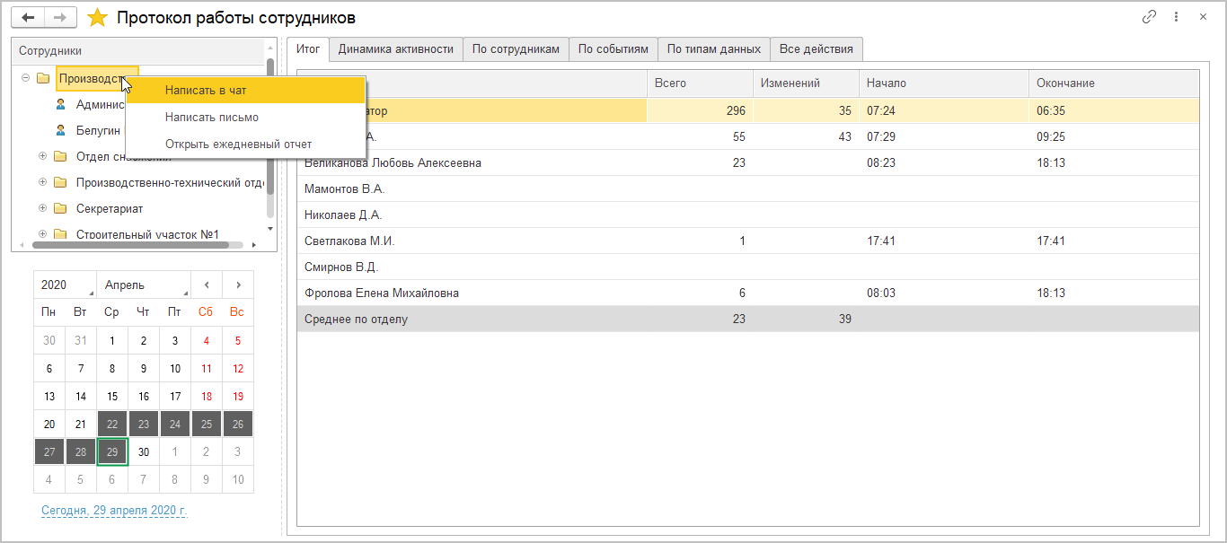 Из списка подразделений можно написать сотрудникам письмо или сообщение в чате и открыть ежедневный отчет. Для этого в контекстном меню предусмотрены соответствующие команды.