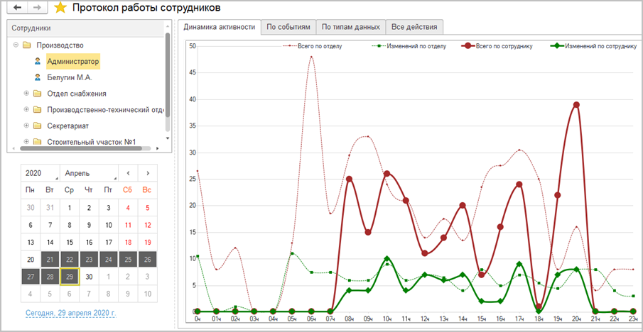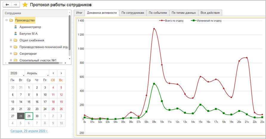 На закладке Динамика активности – графики активности по работе в программе и количеству внесенных изменений. Если выбрать подразделение – видны общие данные.