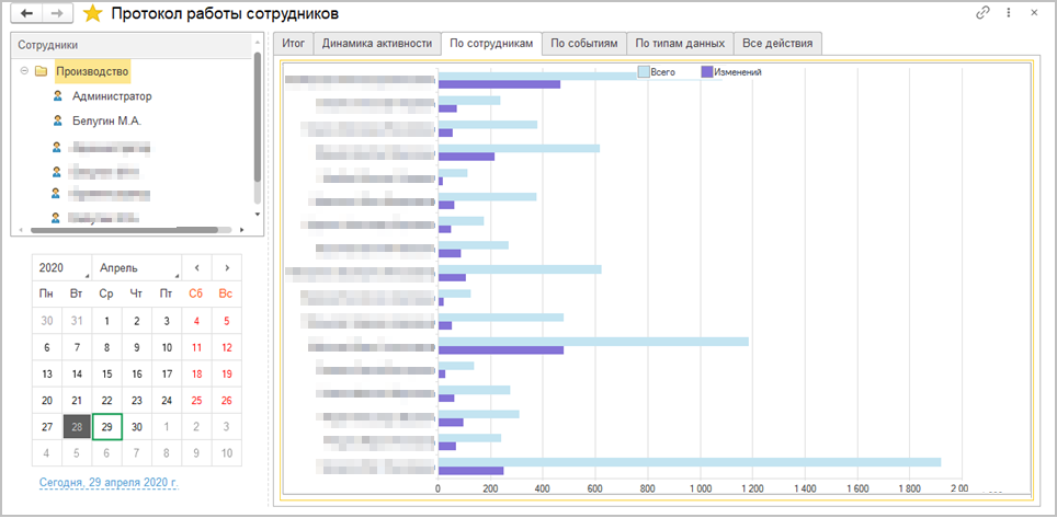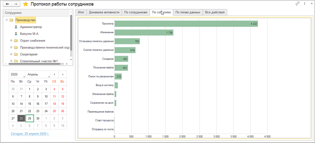 На закладке По событиям видна активность по отдельным действиям: вход в программу, изменение, просмотр и др.