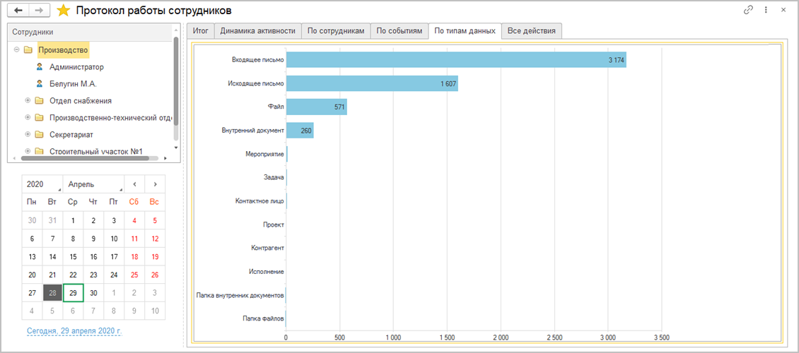 На закладке По типам данных видна активность по отдельным участкам работ: внутренние документы, входящие документы, письма встроенной почты, мероприятия, задачи и пр.