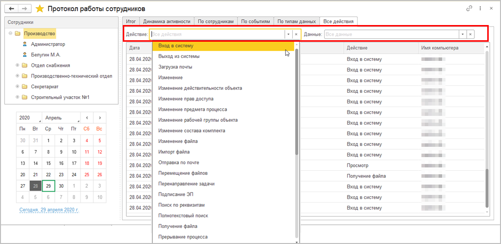 Далее к представленным данным можно применить отборы: по действию или типу данных.