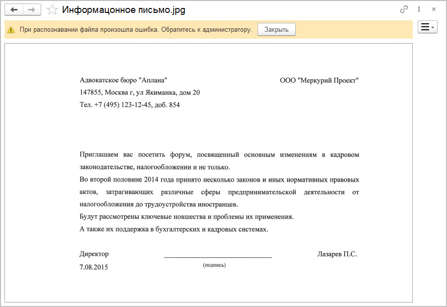 Аналогично, при возникновении ошибки приема мы увидим информацию во входящем электронном документе: