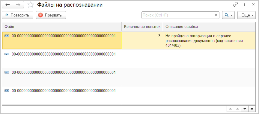 Для строк с ошибками можно Повторить или Прервать распознвание. Здесь отображается текст ошибки из журнала регистрации.