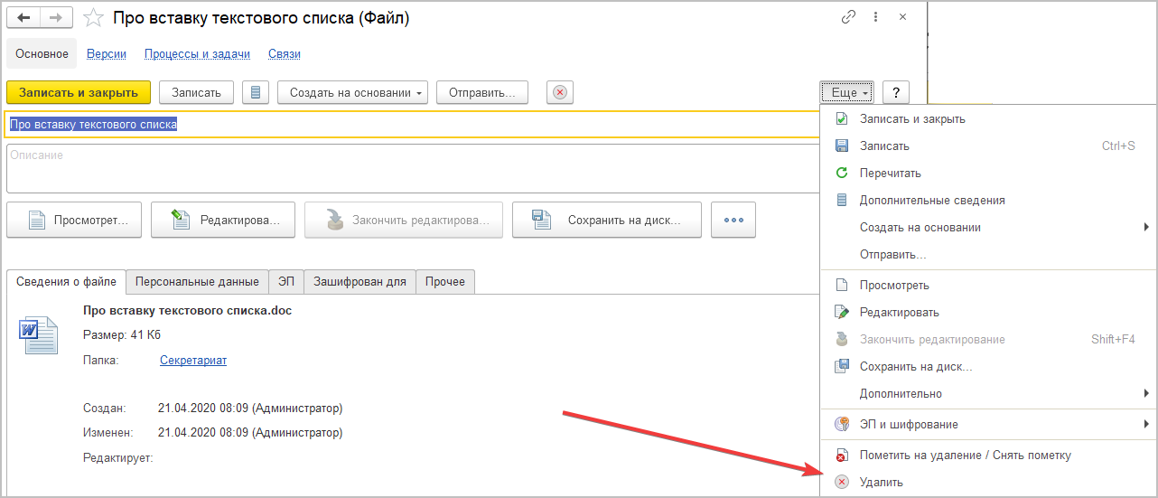 Это может быть полезно, например, если сотрудник по ошибке добавил в программу конфиденциальный файл, который тут же нужно удалить. Команда Удалить, в отличие от Пометить на удаление, теперь полностью сотрет файл без возможности его открыть. Карточка файла при этом останется просто помеченной на удаление.