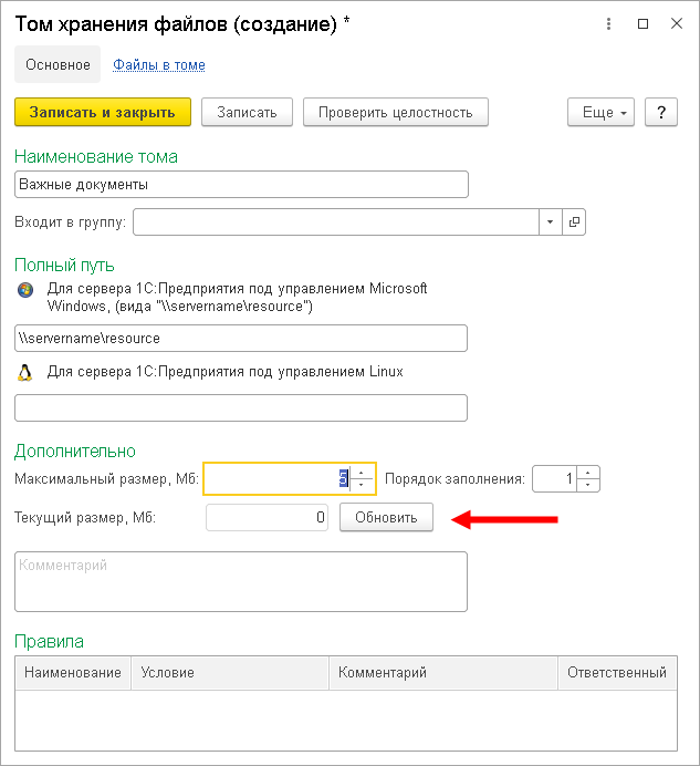 Теперь размер тома хранения файлов рассчитывается автоматически раз в сутки регламентным заданием Обновление размеров файлов томов.