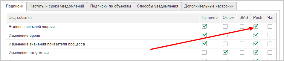 Уведомление может быть отправлено по электронной почте, по SMS, окном в программе или через чат. Настроить, как оповещать пользователя можно в персональных настройках: Настройки – Персональные настройки – Уведомления.
