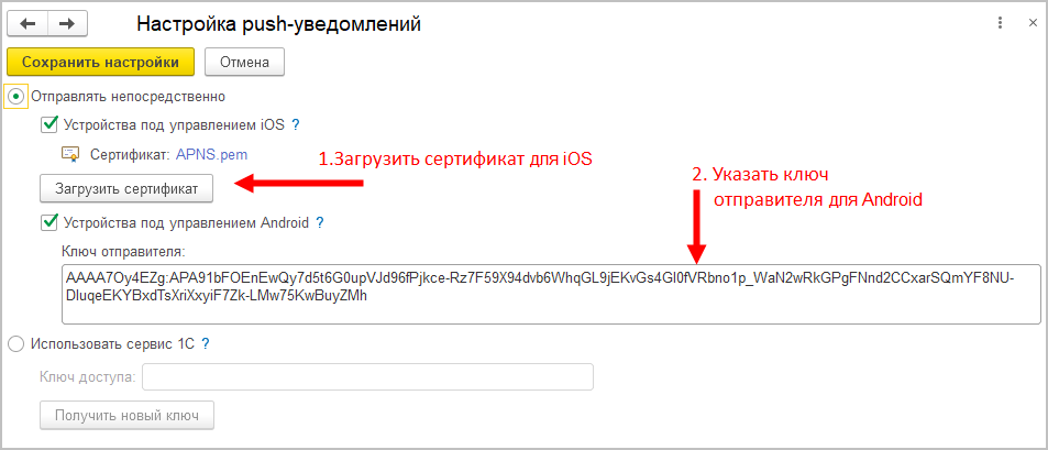 В новой версии программы в качестве альтернативы использования сертификата и ключа можно выбрать сервис 1С для рассылки push-уведомлений. Подробнее.