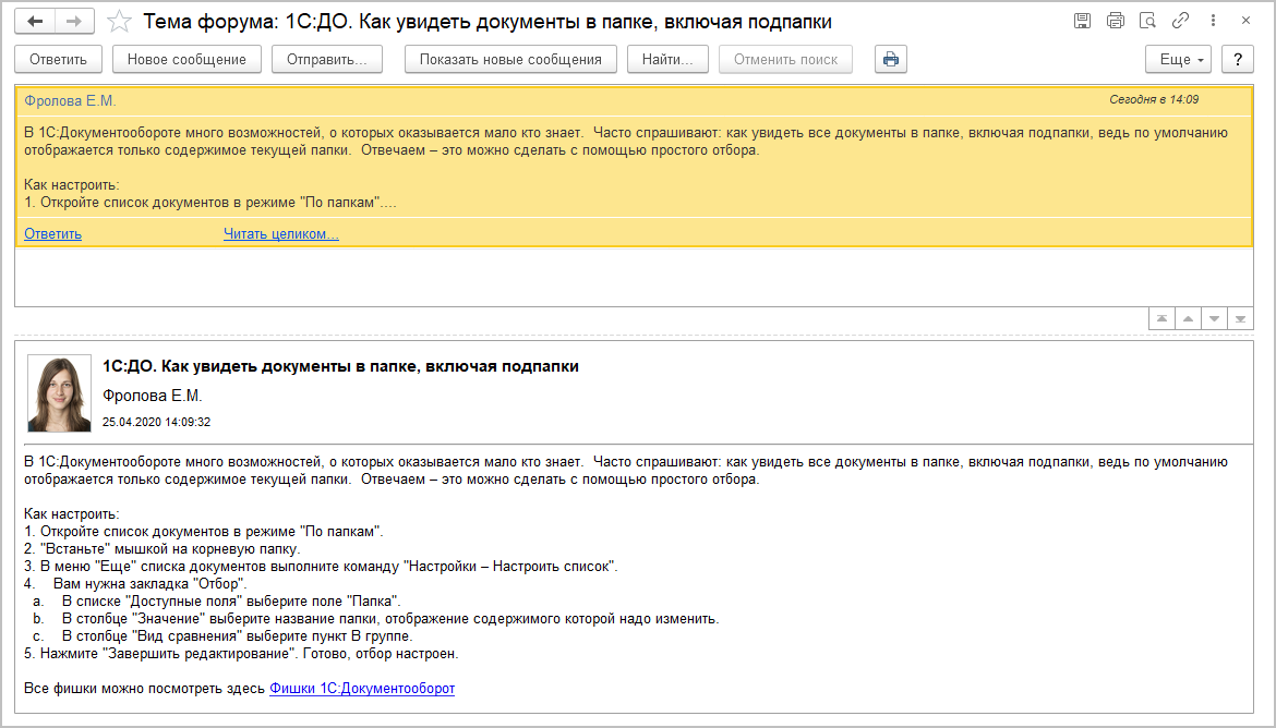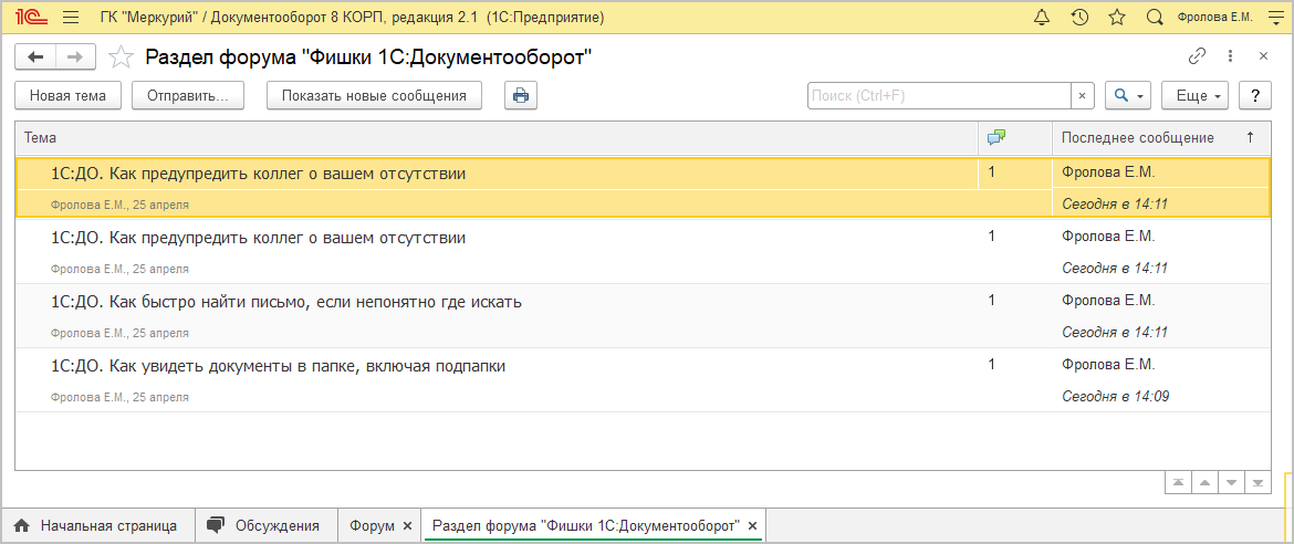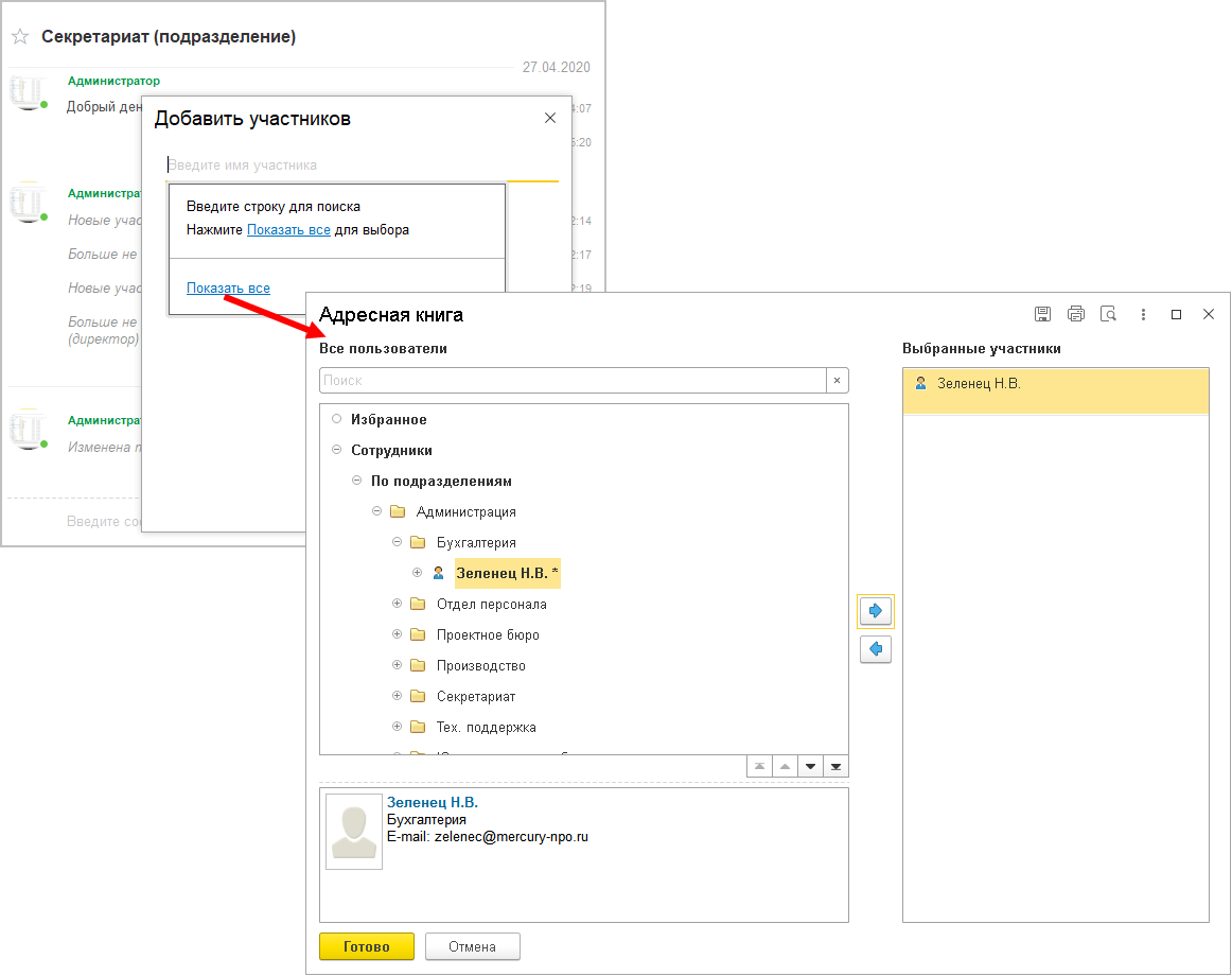 Для сотрудников подчиненного отображается только одно обсуждение – Секретариат (подразделение).