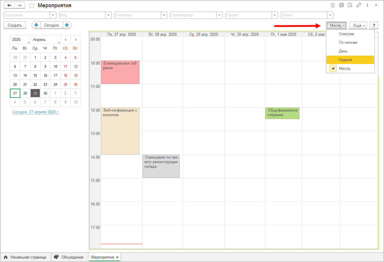 В списке Все мероприятия появился просмотр в виде календаря – на день, неделю, месяц. Выбрать режим можно на командной панели.