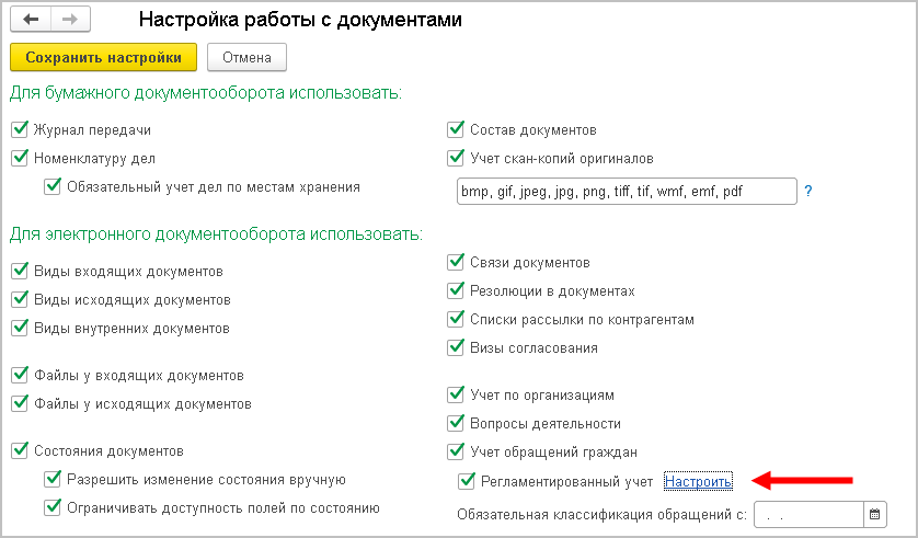 Это можно сделать сразу с помощью помощника обновления или позже в настройках программы (Настройка и администрирование – Настройка программы – Делопроизводство – Регламентированный учет – Настроить).