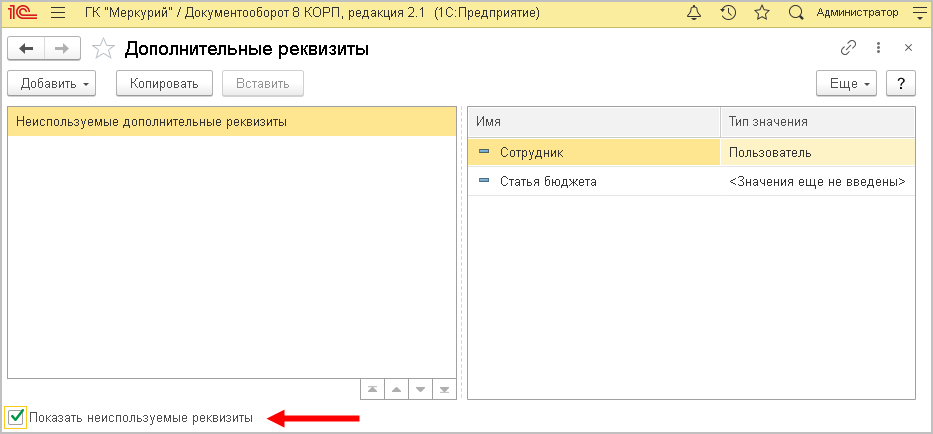 В списке дополнительных реквизитов (Настройка и Администрирование – Дополнительные реквизиты) теперь можно установить флаг Показать неиспользуемые реквизиты и посмотреть список реквизитов и сведений, которые больше не используются в программе и принять решении об их удалении.