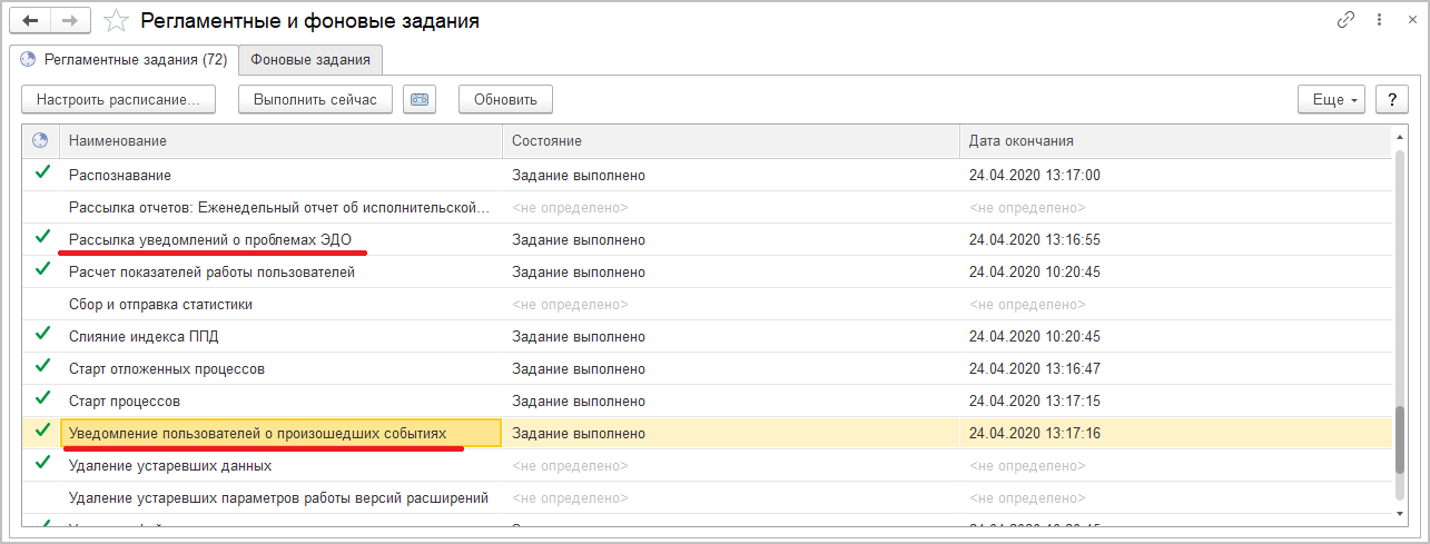 Для работы этой возможности прежде всего нужно включить регламентные задания Рассылка уведомлений о проблемах ЭДО и Уведомление пользователей о произошедших событиях.