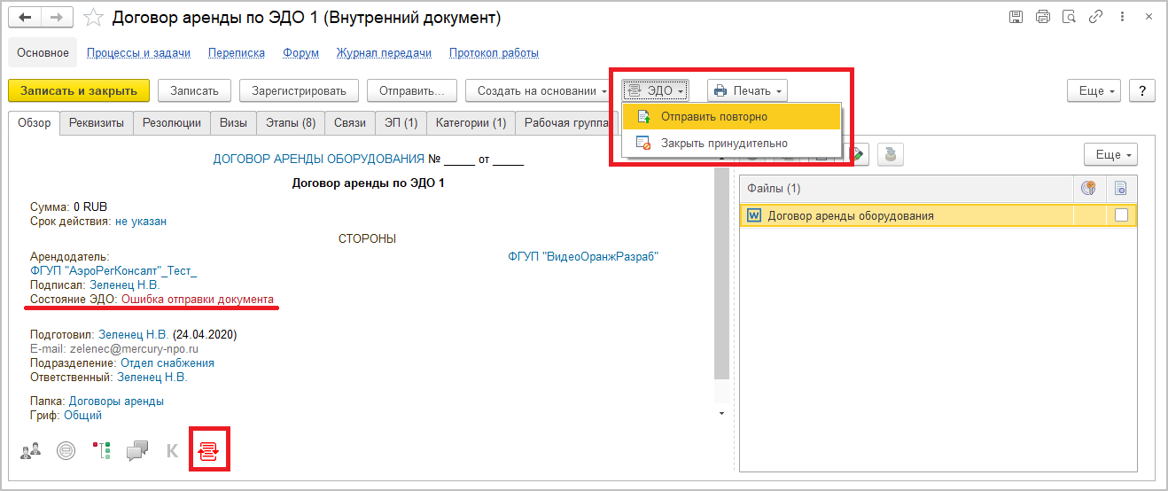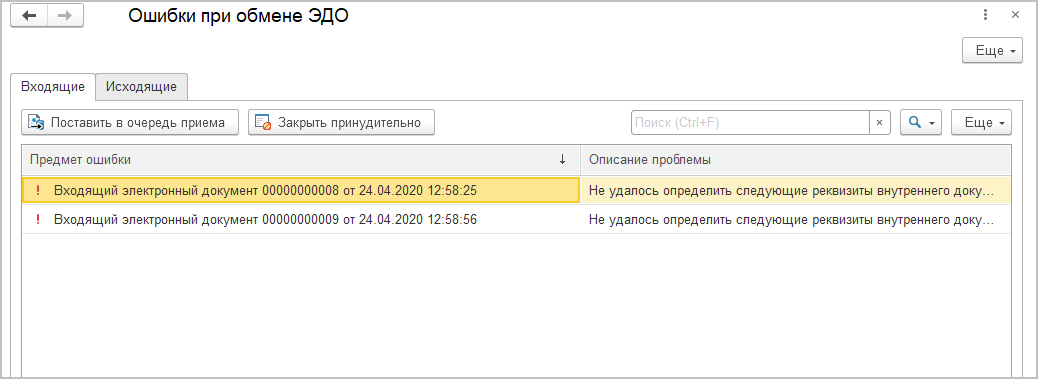 При ошибке обмена в проблемном документе изменится состояние и появится соответствующая иконка. После исправления ошибок можно поставить документ обратно в очередь отправки, либо отказаться от обмена, принудительно закрыв документ: