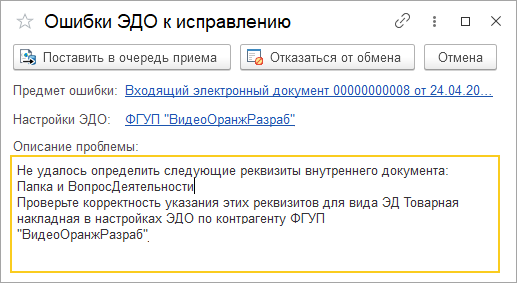 При нажатии на иконку ЭДО во внутреннем документе или на гиперссылку с указанием ошибки во входящем электронном документе пользователь увидит описание ошибки с советом по исправлению и возможностью повторно поставить документ в очередь отправки или приема, а также отказаться от обмена.