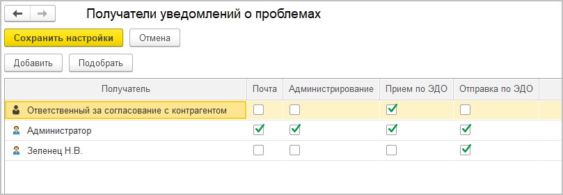 Рассылка уведомлений пойдет по заранее указанному списку ответственных. Этот список можно настроить в разделе Настройка и администрирование – Настройка программы – Обмен данными – Использовать обмен электронными документами – Настроить.