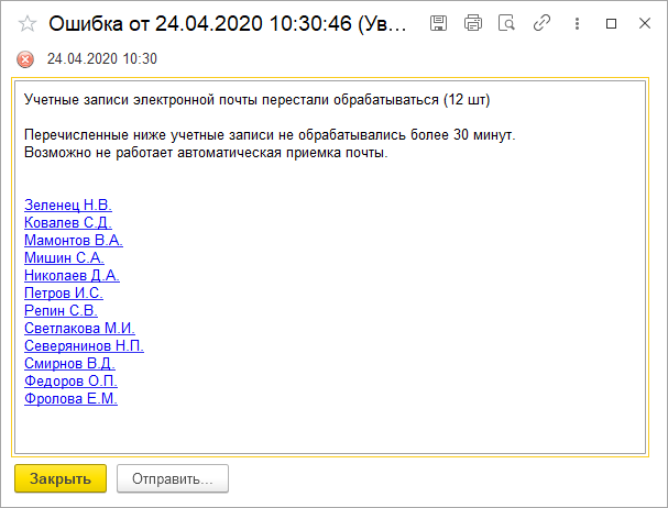При возникновении проблемы в работе программы выбранные пользователи получат уведомление.