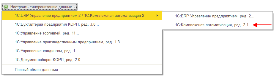 Синхронизация данных поддерживается только между «1С:Документооборотом» редакции 2.1 и «1С:Комплексной автоматизацией» редакции 2.1.
