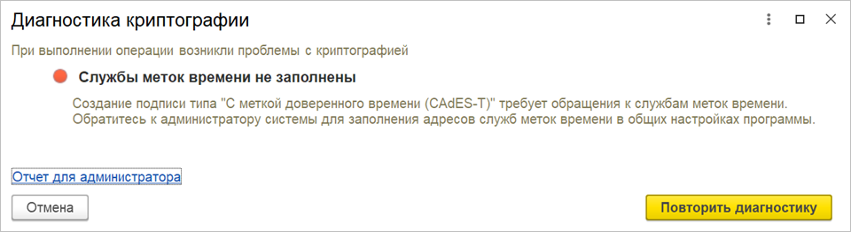 ● В диагностику криптографии добавлена проверка адресов меток доверенного времени. Теперь при отсутствии адресов меток доверенного времени или их недоступности в форме диагностики выводится соответствующее сообщение.