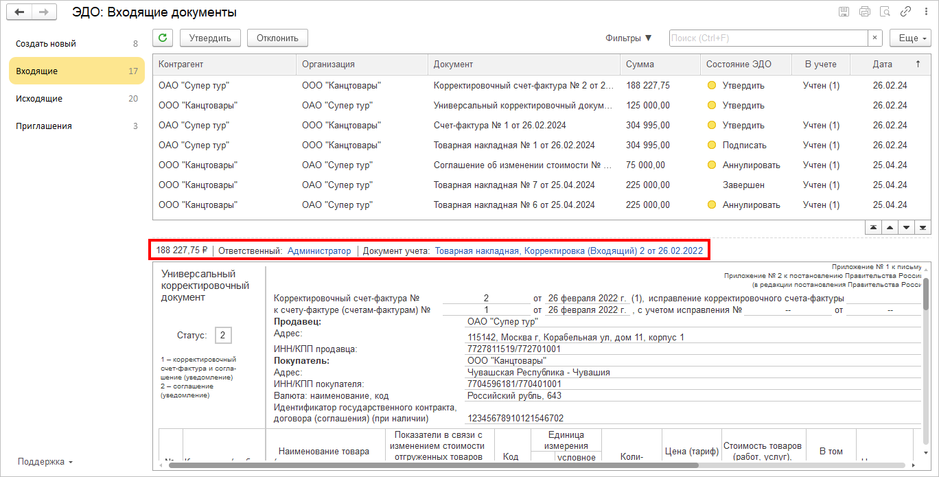 ● Реализована возможность отключить автоматическое прохождение проверки полномочий для подписей документов по МЧД с текстовыми полномочиями “Все полномочия” или “Полные полномочия”. Опцию можно найти в меню Администрирование - Обмен электронными документами - Обмен с контрагентами - Отключить автоматическое доверие полным полномочиям.