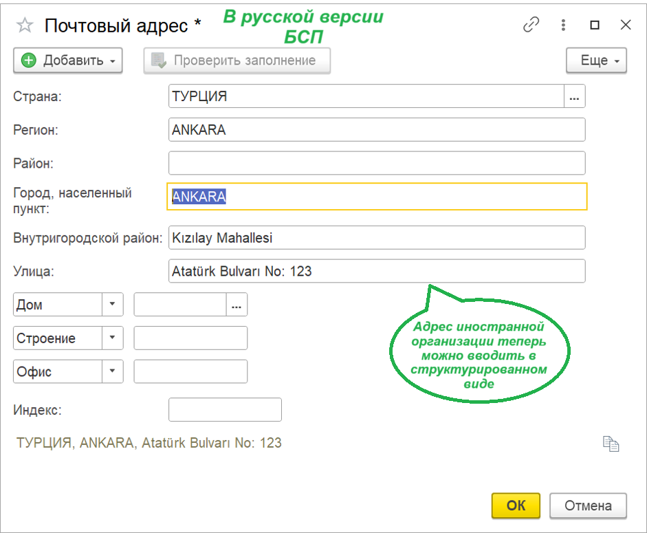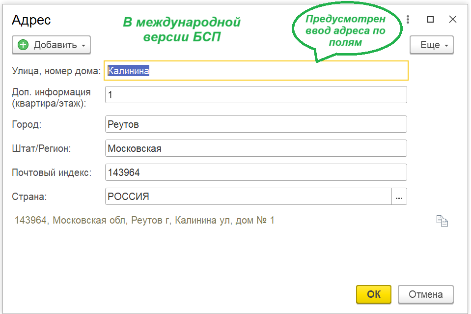 РаботаСАдресами.УправлениеКонтактнойИнформацией добавлена новая функция ПредставлениеАдреса, которая формирует строковое представление адреса в соответствии с заданным набором и порядком полей.